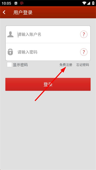 3、進入用戶登錄頁面需輸入賬戶名與密碼,可選擇顯示密碼,同時能通過免費注冊或忘記密碼功能來完成賬戶相關的操作步驟。