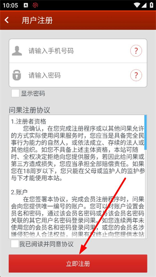 4、進入用戶注冊頁面需輸入手機號碼和密碼,閱讀并同意問果注冊協議后,點擊立即注冊按鈕即可完成賬戶的注冊流程。
