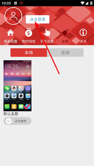 2、進入主題頁面可見點擊登錄按鈕,還有桌面設置我的錢包等功能選項,當前展示本地默認主題且該主題處于正在使用的狀態。