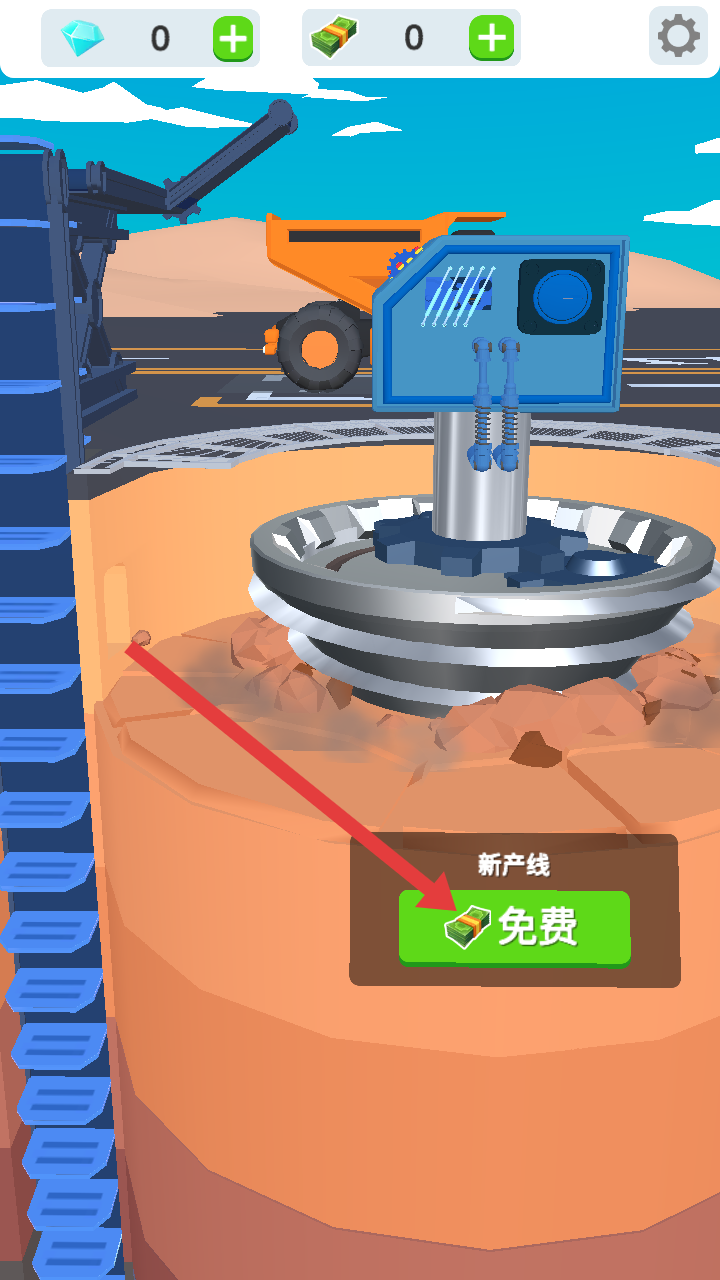 1、進入游戲,能看到采礦設備,可點擊免費按鈕開啟新產線,開始礦石開采工作。