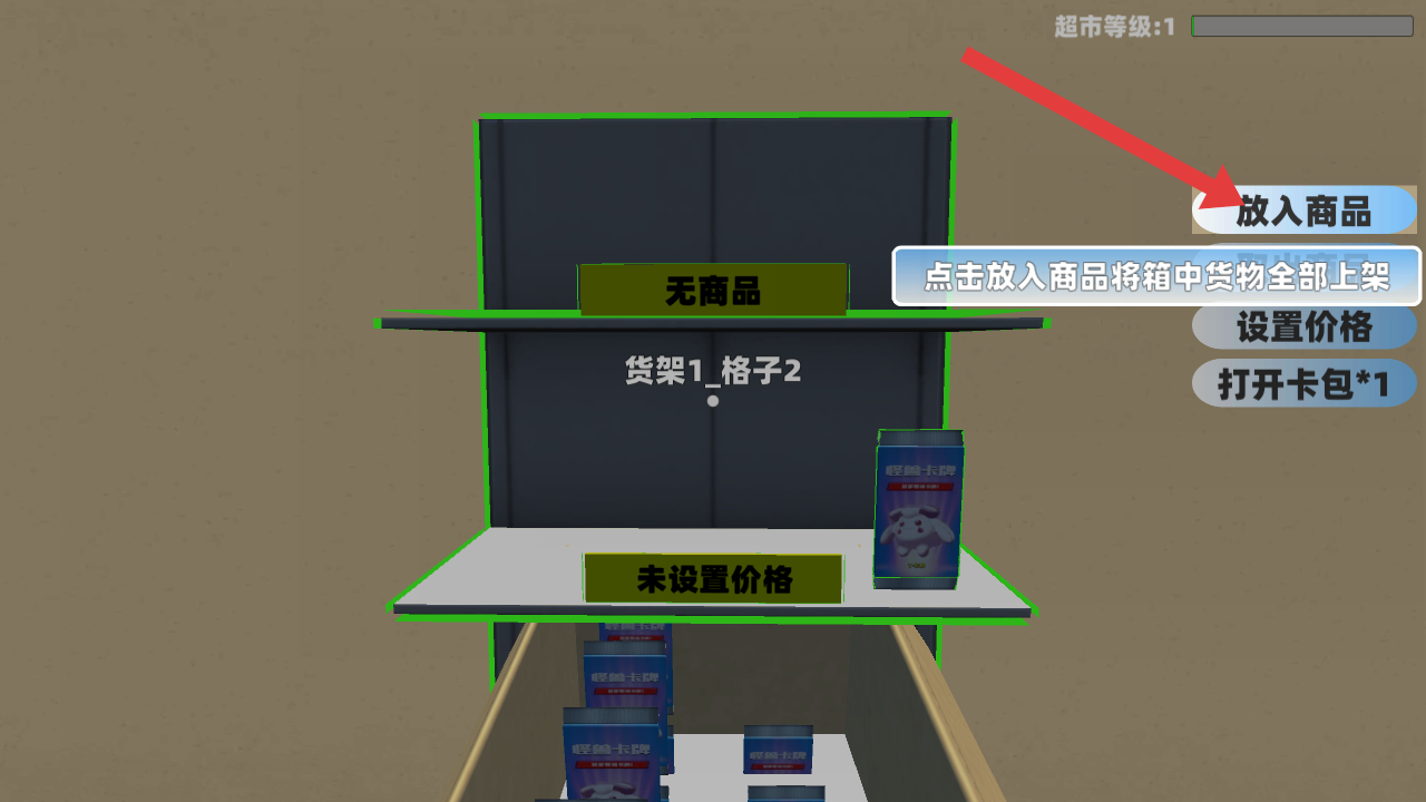 2、面對無商品的貨架,點擊放入商品,可將箱中貨物全部上架,充實貨架商品。