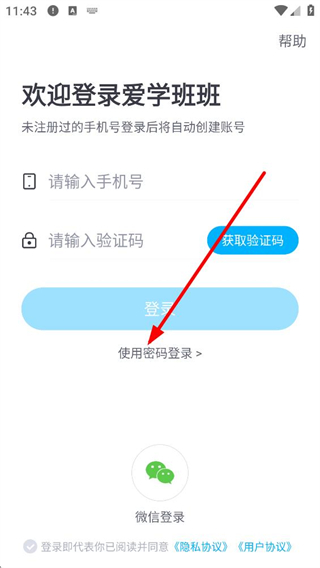 1、進入愛學班班登錄頁,可輸入手機號和驗證碼登錄,未注冊的手機號登錄后自動創建賬號,也能選密碼登錄或微信登錄,需同意相關協議。