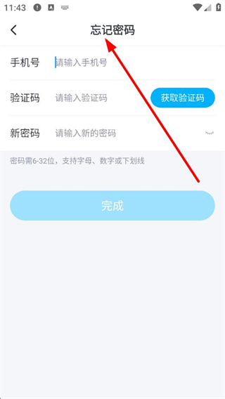 3、忘記密碼頁面,輸入手機號、獲取并填寫驗證碼,設置含字母、數字或下劃線的新密碼,完成后點擊完成即可重置密碼。