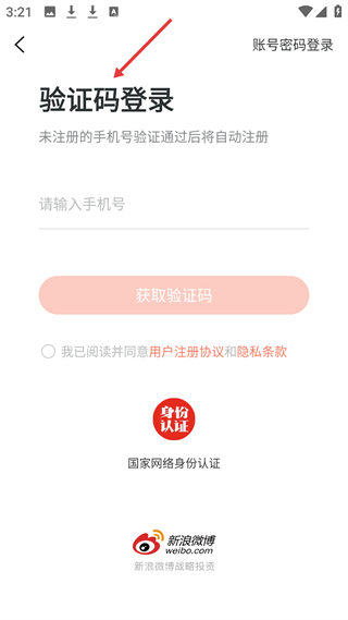 1、登錄頁可驗證碼登錄,輸手機號獲驗證碼登錄,未注冊手機號驗證后自動注冊,還可賬號密碼或微博登錄。