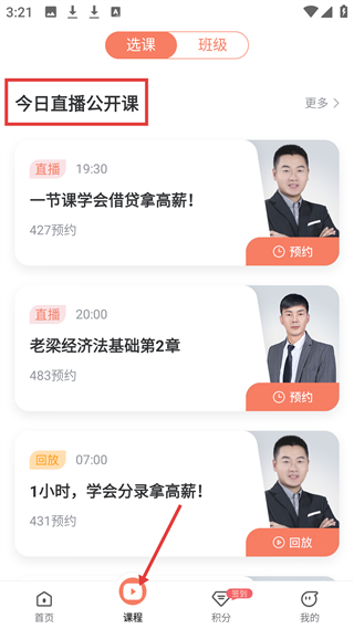 3、課程頁有今日直播公開課板塊,展示多場會計直播課,可預約或看回放,助力學習會計知識。