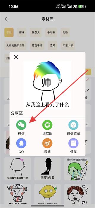 3、在素材詳情頁面可查看素材的具體樣式,準備進行分享操作,選擇自己喜歡的表情包。