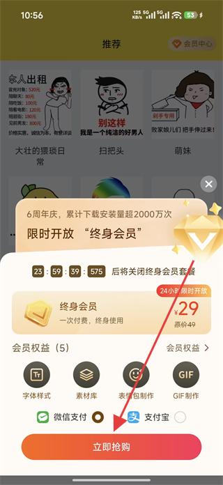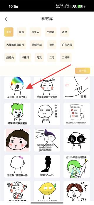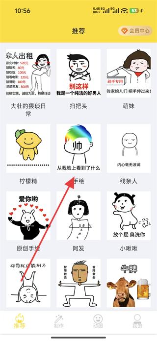 1、進入APP推薦頁面,關閉會員促銷彈窗,瀏覽各類表情包推薦,找到手繪分類下的檸檬精等表情包,點擊進入素材庫頁面。