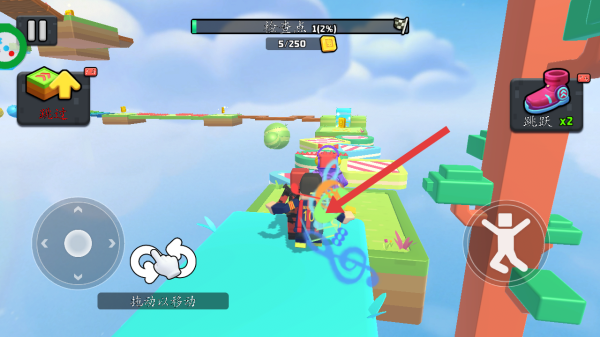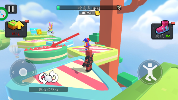 2、通過拖動屏幕來控制角色移動不同的平臺間穿梭,躲避障礙,朝著目標位置前進。