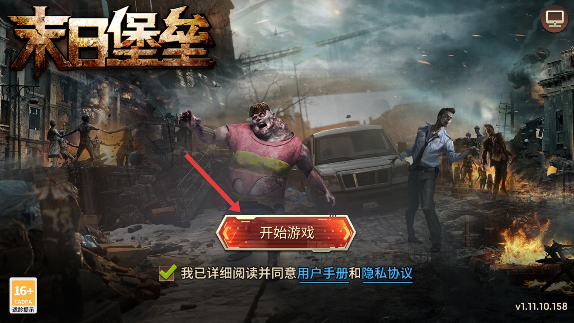 1、進入游戲,勾選我已詳細閱讀并同意用戶手冊和隱私協議,點擊開始游戲,即可開啟末日冒險之旅。