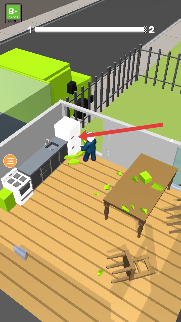 2、室內場景中將白色冰箱等家具挪動到合適位置然后搬走,同時清理周圍散落的綠色碎塊,整理空間。