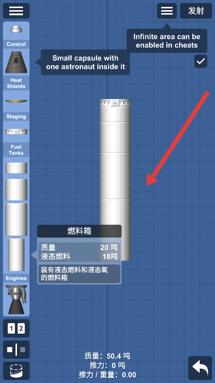 1、進入游戲后,火箭組裝界面可選擇燃料箱等部件,查看燃料箱質量、液態燃料量等信息,為火箭組裝做準備。