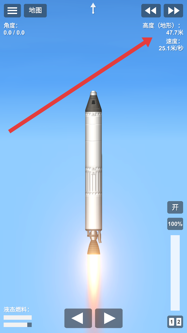 4、隨著火箭飛行,能看到高度、速度等數據變化,觀察火箭空中的飛行狀態,體驗火箭發射的模擬過程。