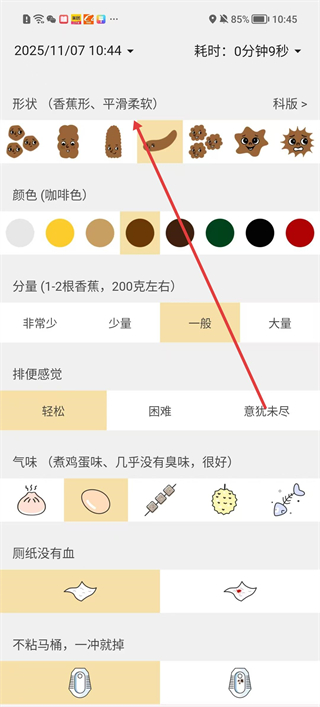 3、在記錄頁面可選擇排便的形狀、顏色、分量、排便感覺、氣味等信息,如形狀選擇香蕉形、顏色選擇咖啡色、分量選擇一般等,記錄排便情況。