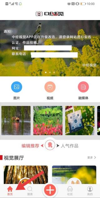 1、點擊首頁,提示正在升級改造,設有圖片、視頻等板塊,呈現編輯推薦及視覺展廳作品。
