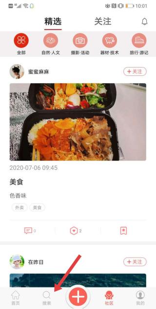 2、點擊搜索精選界面,涵蓋自然人文等分類,展示用戶分享的美食等內容,便于發現精彩。