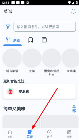 3、點擊菜譜進入菜譜界面,可通過搜索條件查找菜譜,瀏覽所有菜譜、主菜等分類,查看零浪費、簡單又美味的智能烹飪推薦。