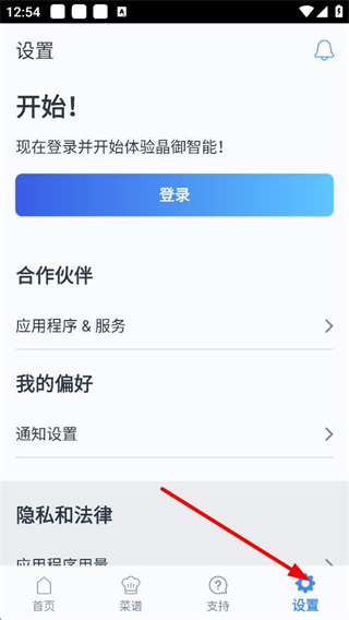 2、點擊設置進入設置界面,可進行登錄操作,查看合作伙伴、我的偏好等設置選項,管理通知設置和隱私法律相關內容。