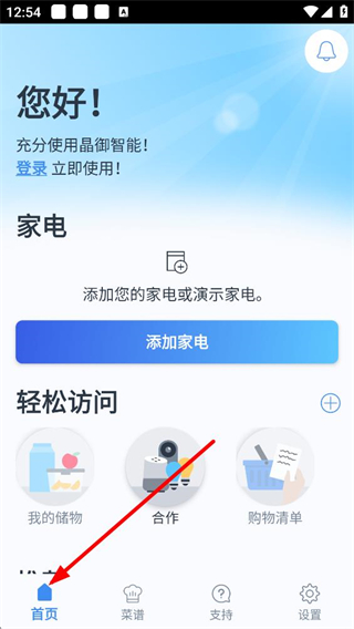 1、進入首頁,可添加家電或演示家電,使用我的儲物、購物清單等輕松訪問功能,底部有首頁、菜譜等功能入口。