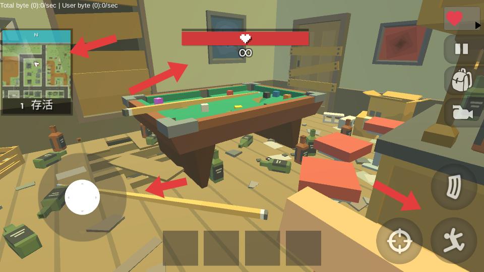 3、之后到房屋內等游戲場景中,可查看地圖,利用操作按鈕移動,攻擊,在場景里探索,尋找資源等。