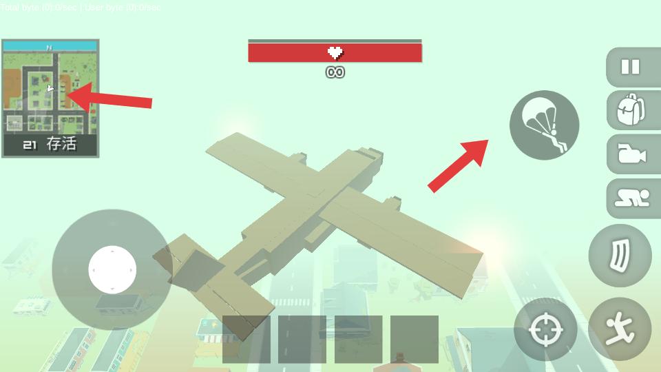 4、還能乘坐飛機,點擊降落傘按鈕跳傘,降落到不同區域,繼續在游戲世界里冒險,爭取成為存活到最后的玩家。
