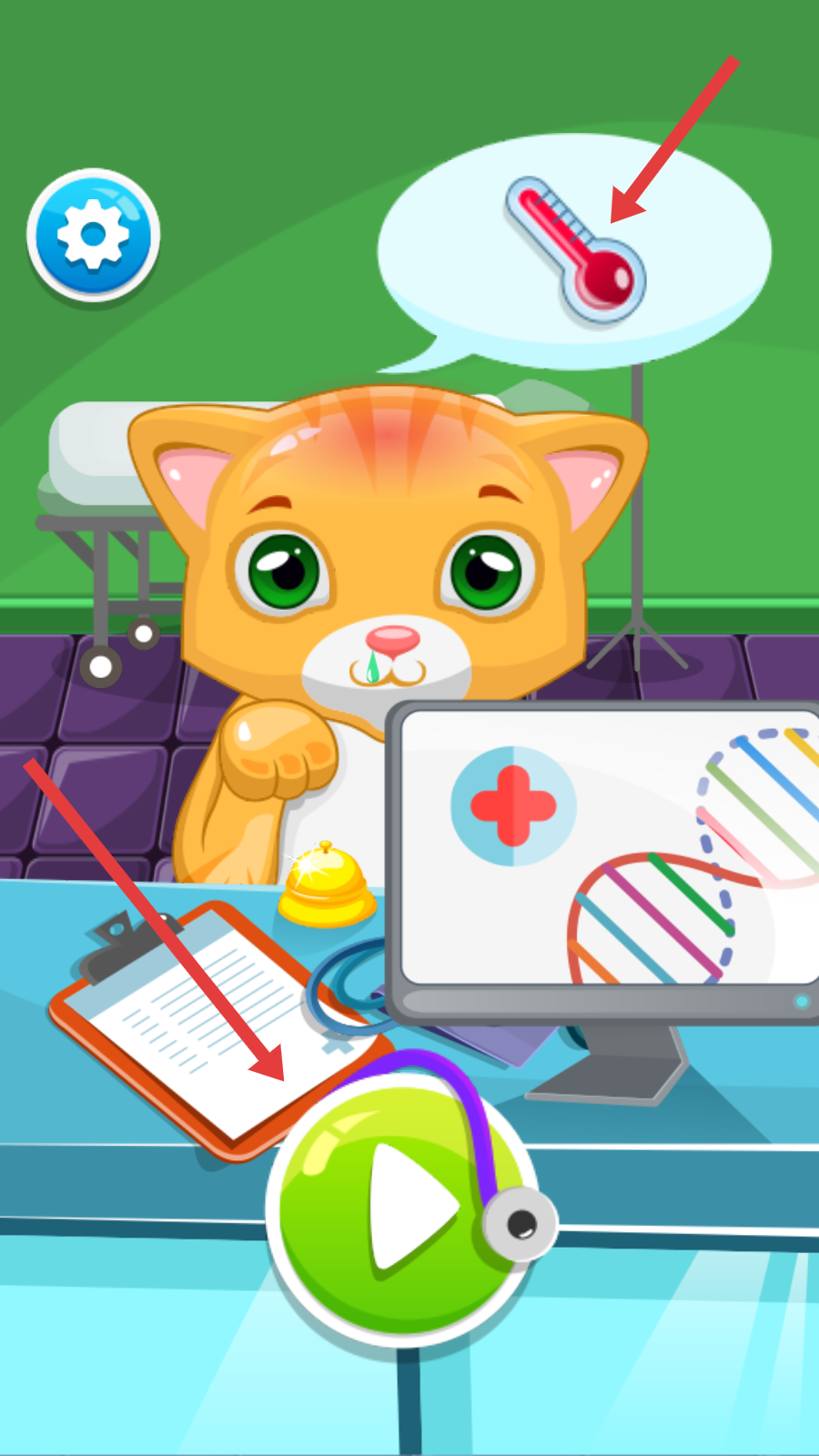 2、在診療選擇界面,有溫度計、爪子等多種診療項目圖標,可選擇相應項目,點擊綠色播放按鈕,進入具體診療環節。