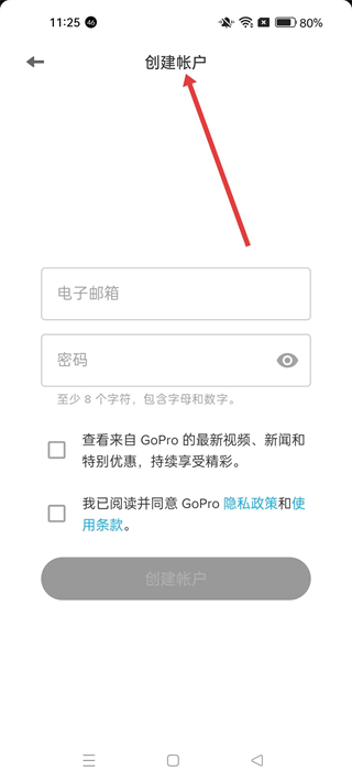 3、創建賬戶時,需填寫電子郵箱和密碼,密碼至少8個字符且包含字母和數字,還需勾選同意相關條款等選項后完成創建。