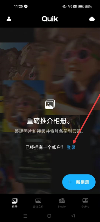 1、進入Quik應用,看到重磅推介相冊的介紹,若已有賬戶可點擊登錄,也可點擊新相冊開始整理照片和視頻并備份到云端。