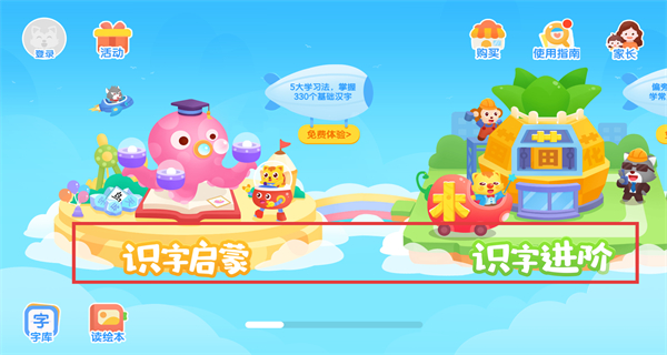 1、首頁分識字啟蒙、識字進階模塊,含字庫、讀繪本功能,提供5大學習法掌握330個基礎漢字的免費體驗入口,是課程選擇核心界面。
