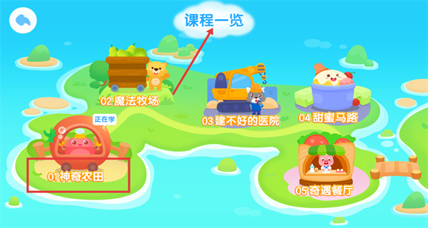 2、課程一覽頁展示神奇農田等課程主題,標注正在學狀態,通過卡通場景呈現不同識字課程,是課程選擇的主題導航頁。