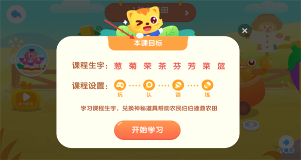 4、本課目標頁展示蔥、菊等課程生字,明確玩、認、讀、練流程,以拯救農田為任務驅動,設開始學習按鈕啟動課程。