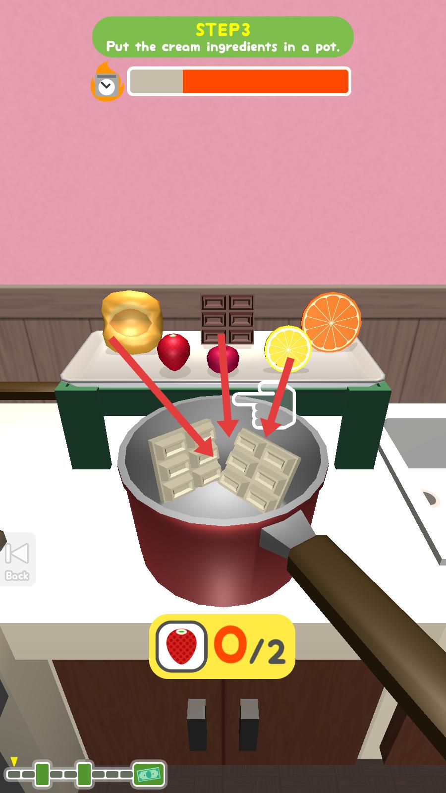 4、到步驟三,依據把奶油原料放進鍋里的指示,將奶油所需的原料放入鍋中,同時留意下方草莓的收集進度。