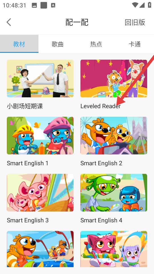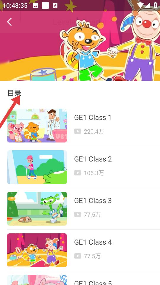 2、在配一配的教材欄選擇課程如Leveled Reader,點擊后進入目錄頁查看GE1Class1等具體課程視頻,了解內容與播放量,方便挑選適配的英語學習內容。