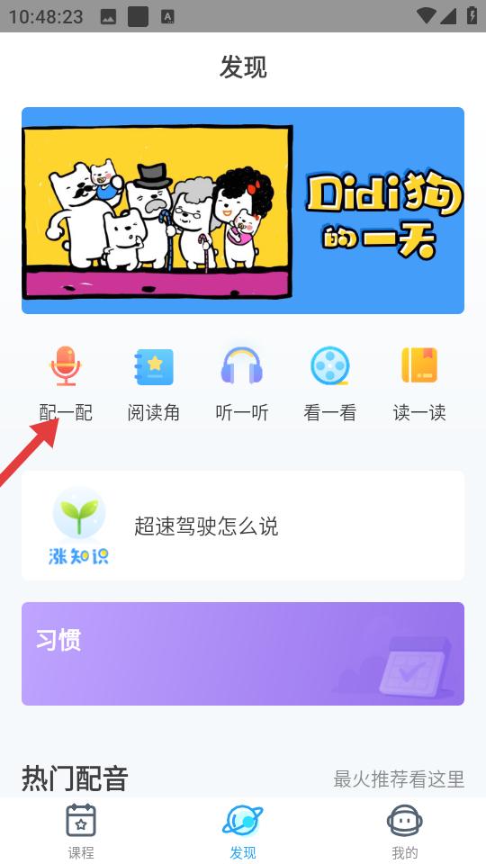1、進入發現頁面可見配一配、閱讀角、聽一聽等功能入口,選定配一配可進入教材分類界面,瀏覽小劇場短期課為英語學習提供多樣選擇。