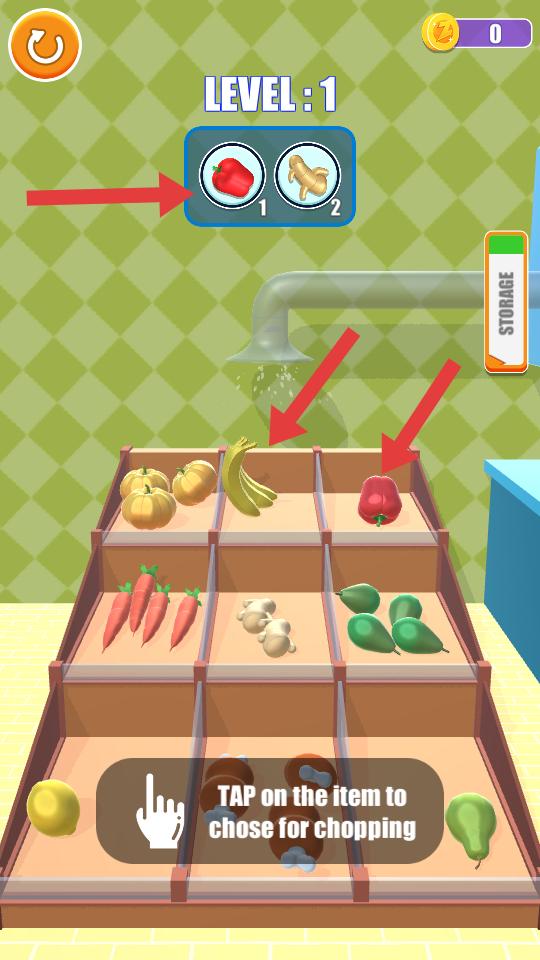 2、游戲界面上方需求提示,從貨架上點擊選取紅椒和香蕉,為食材的切碎處理做準備。