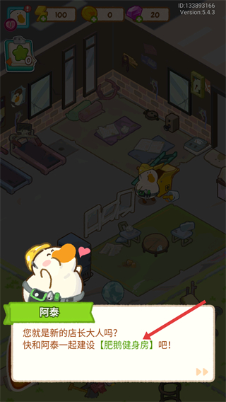 2、阿泰會詢問是否是新的店長大人,邀請一起建設肥鵝健身房,開啟健身房的建設之旅。