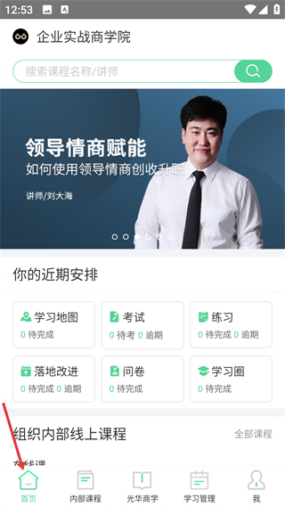 2、登錄后進入首頁,有搜索課程或講師的搜索欄,展示課程推薦,設學習地圖、考試等近期安排入口,底部有首頁、內部課程等導航欄。