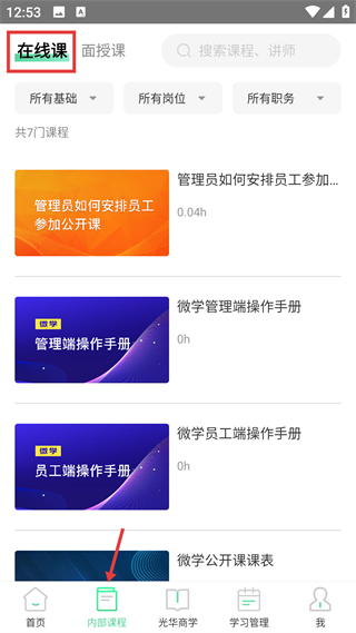 3、點擊內部課程進入對應頁面,分在線課、面授課標簽,可按基礎、崗位等篩選,展示多門課程,標注課程時長等相關信息。