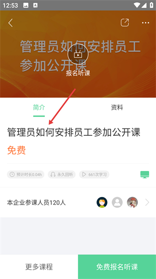 4、選擇課程進入詳情頁,查看課程名稱、是否免費及預計時長,顯示學習次數,可查看本企業參課人員,點擊免費報名聽課參與學習。