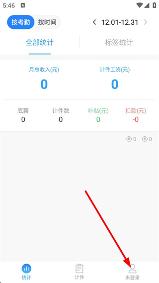 1、進入統計頁面,可切換按考勤或按時間查看,頁面展示月總收入計件工資等薪資相關數據,當前處于未登錄狀態,底部有統計計件等功能選項。