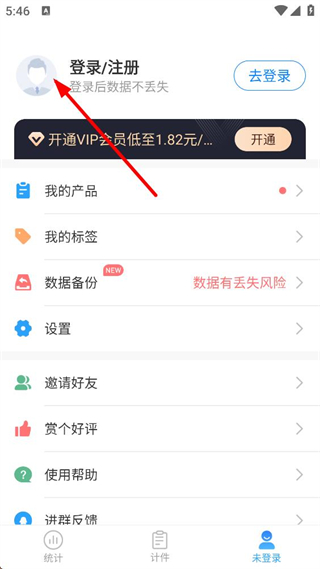2、進入未登錄頁面,可進行登錄或注冊操作,頁面包含我的產品我的標簽等功能入口,同時提示登錄后數據不會丟失,還可開通VIP會員。