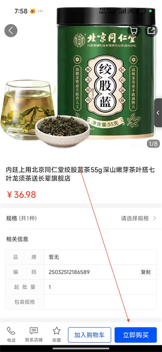 3、在搜索結果頁切換至商城分類,瀏覽展示的商品如紋股藍茶葉等,點擊商品進入詳情頁,查看價格規格等信息。