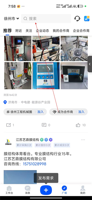 1、打開樂筑平臺進入首頁,定位選擇徐州市,瀏覽推薦的企業動態內容,點擊搜索框進入搜索頁面。