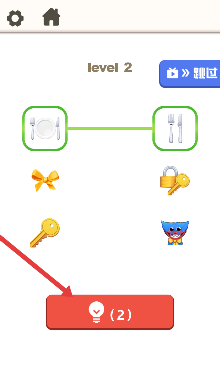 4、到第二關,界面有餐具、鑰匙等元素,若遇到困難,可點擊下方帶燈泡圖標的按鈕獲取提示。