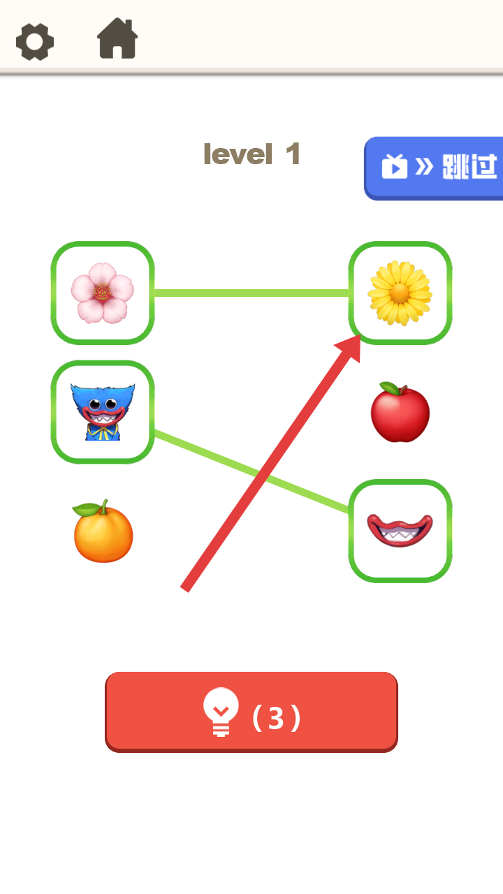 2、來到第一關界面有花朵、卡通形象等元素,需按照規則將相關元素連線,完成關卡目標。