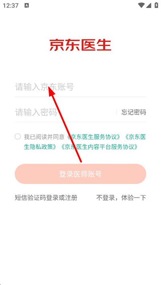 3、切換至賬號密碼登錄界面,需輸入京東賬號和密碼,勾選相關協議后點擊登錄醫師賬號,也可選擇短信驗證碼登錄或注冊。