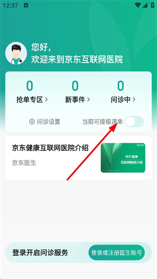1、進入京東互聯網醫院醫師端首頁,可看到搶單專區新事件問診中等板塊,能設置問診相關選項,還可選擇登錄開啟問診服務或注冊醫生賬號。