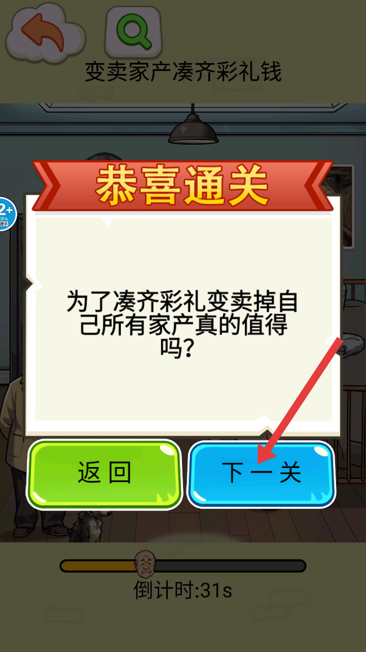 4、成功湊齊彩禮后,會顯示恭喜通關,并提出為了湊齊彩禮變賣掉自己所有家產真的值得嗎的問題,點擊下一關可繼續挑戰。