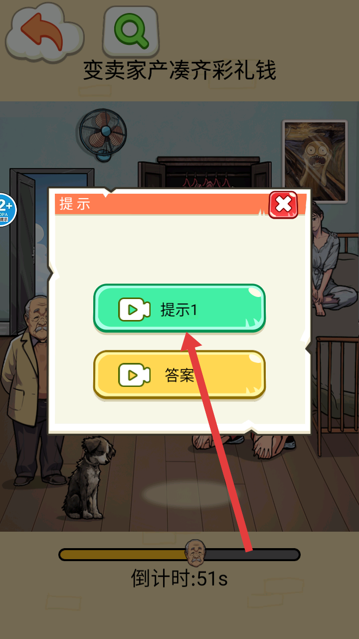 3、若湊彩禮過程中遇到困難,可點擊提示按鈕,選擇觀看視頻獲取提示1,助力完成任務。