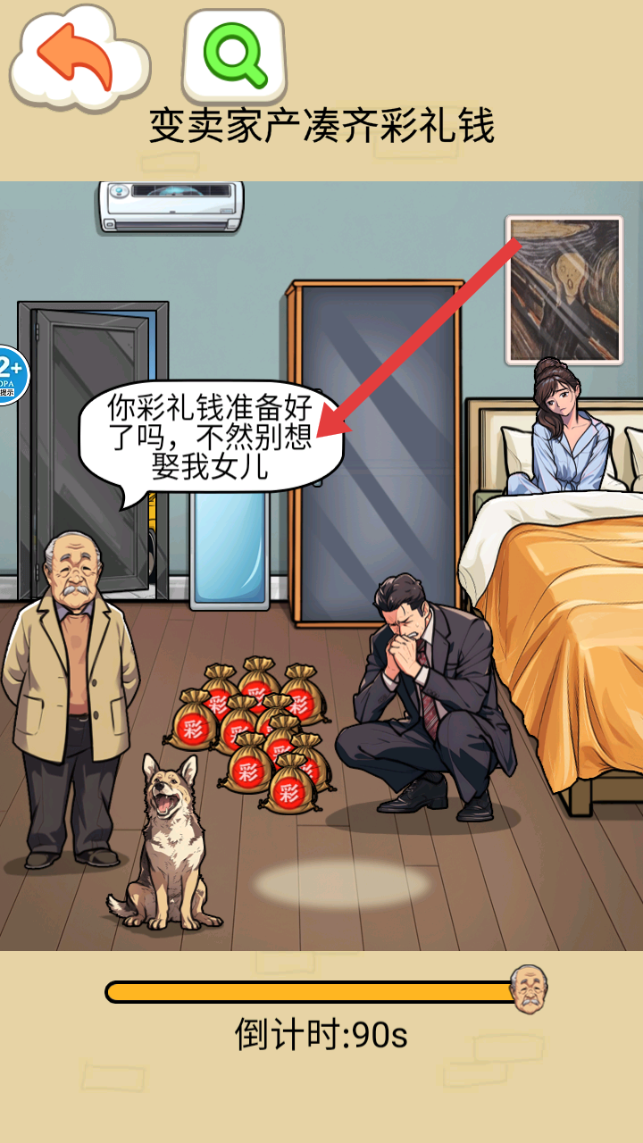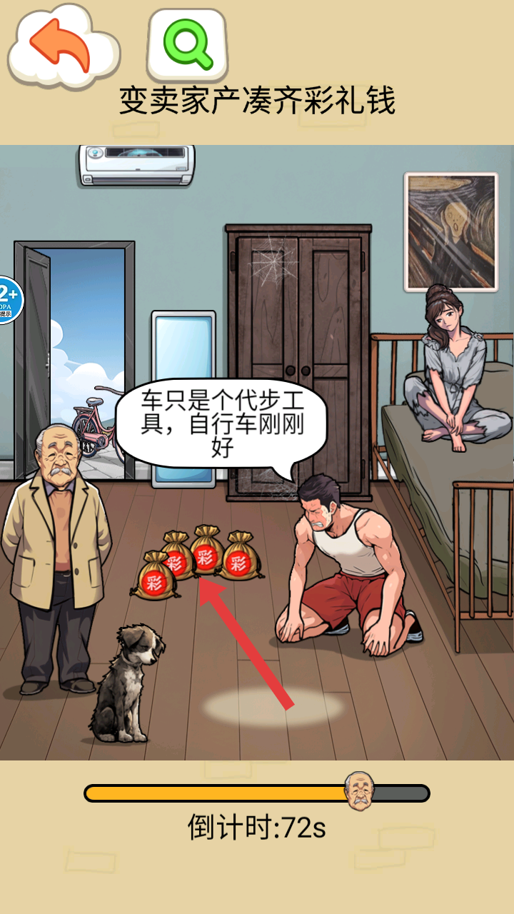 1、進入游戲,面對變賣家產湊齊彩禮錢的任務,場景里有老人、男人、女人和彩禮袋等元素,需開始湊彩禮操作。
