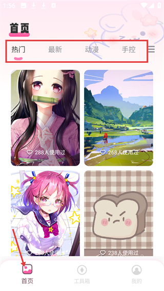1、首頁有熱門、最新、動漫、手控等分類,展示各類圖片資源并標注使用人數,方便用戶瀏覽選擇心儀圖片。